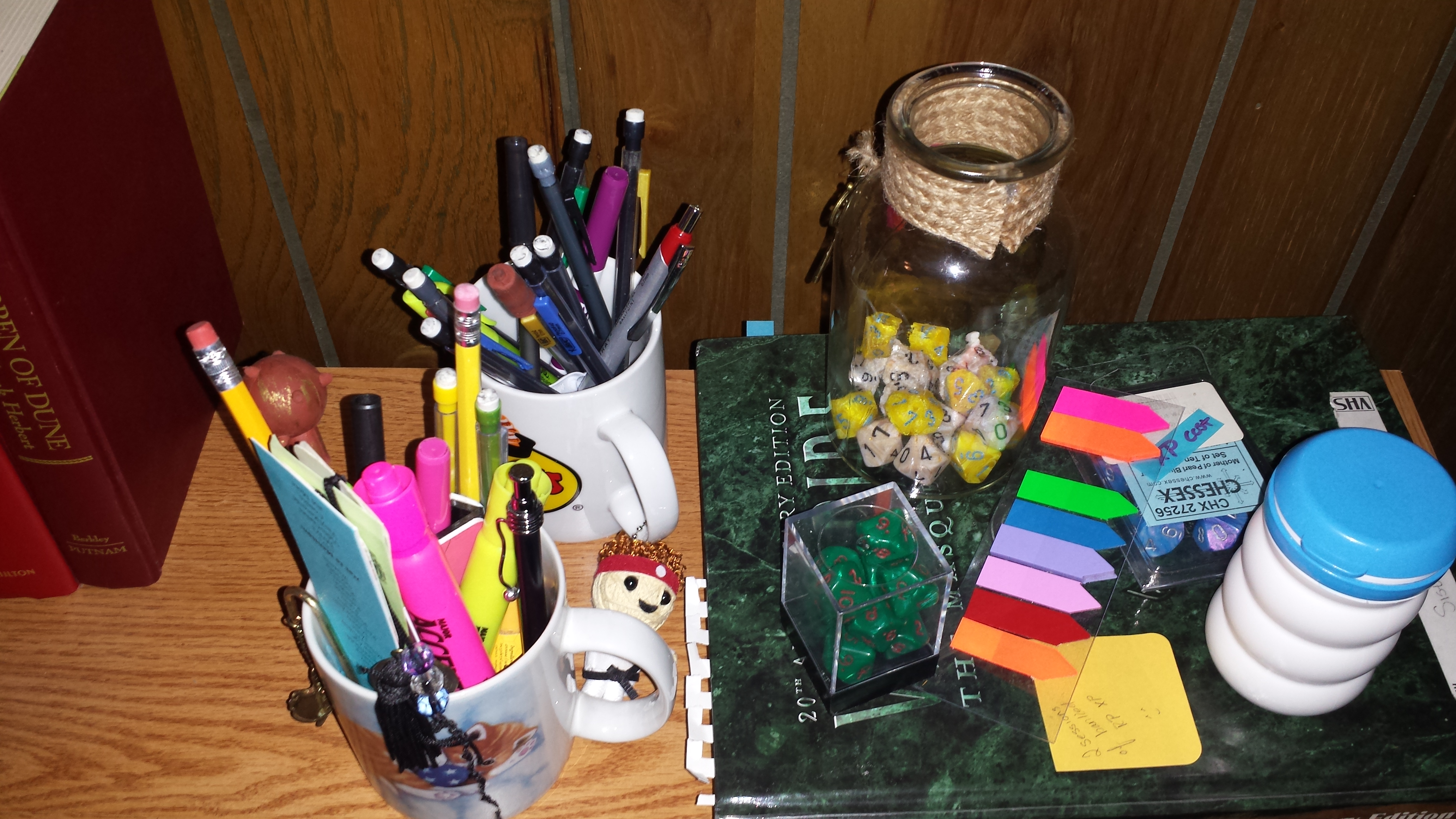 2. More gaming supplies. This is stuff like tiny post-it notes for our books to note things, cups of pencils and pens, notebooks of notes from longer stories, sketchbooks for map-making, etc. There is something on almost every shelf. The shelf it’s intended for though is my favorite. I just really love those mugs, so damn handy