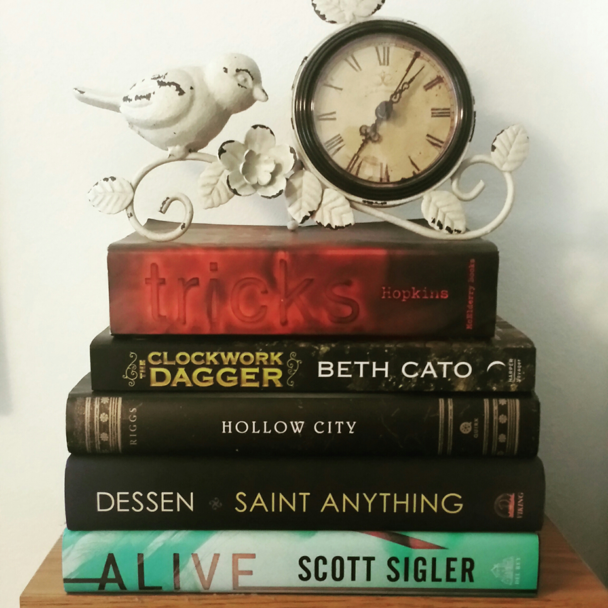 Alive by Scott Sigler is my most recent haul book. Clockwork Dagger by Beth Cato is the first in a series. Hollow City by Ransom Riggs is my unread sequel. Saint Anything by Sarah Dessen is out of my comfort zone and Tricks by Ellen Hopkins has been on my shelf for over a year!