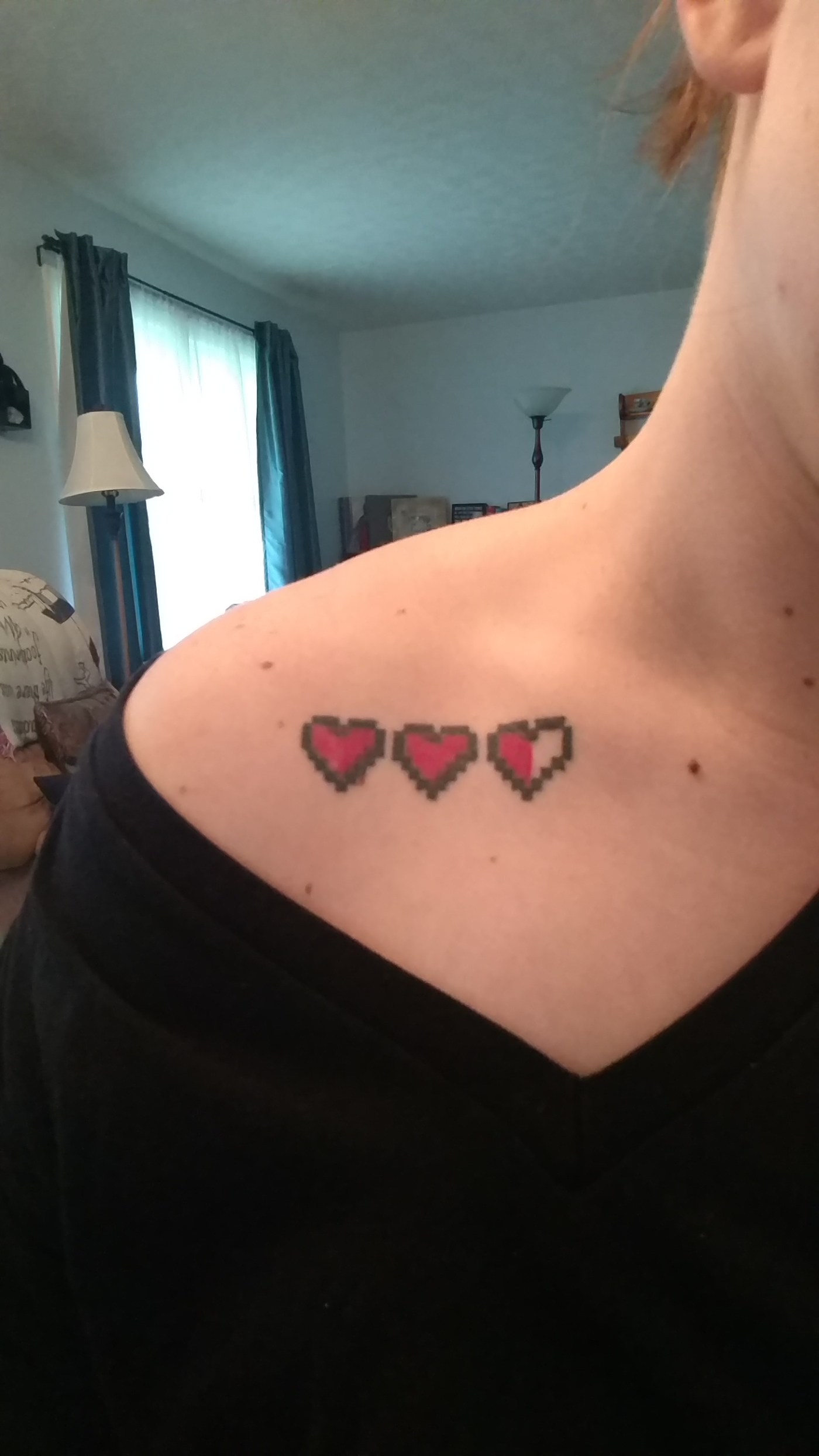 Hey Sarah! Omg I am so in love with all of these!! ^___^ The one of the Lady in the Lake for your mom and grandma is BEAUTIFUL both for the actual art and the meanings you have behind it. The pixel hearts are clearly awesome. And the dagger + roses + “Book Life” piece? Let’s just say I haven’t printed out a picture of it to hang on my wall so I can admire the awesomeness every day… yet… 😛 Seriously, though, thank you for sharing these! As you know, I love tattoos and especially nerdy and/or bookish ones. 🙂